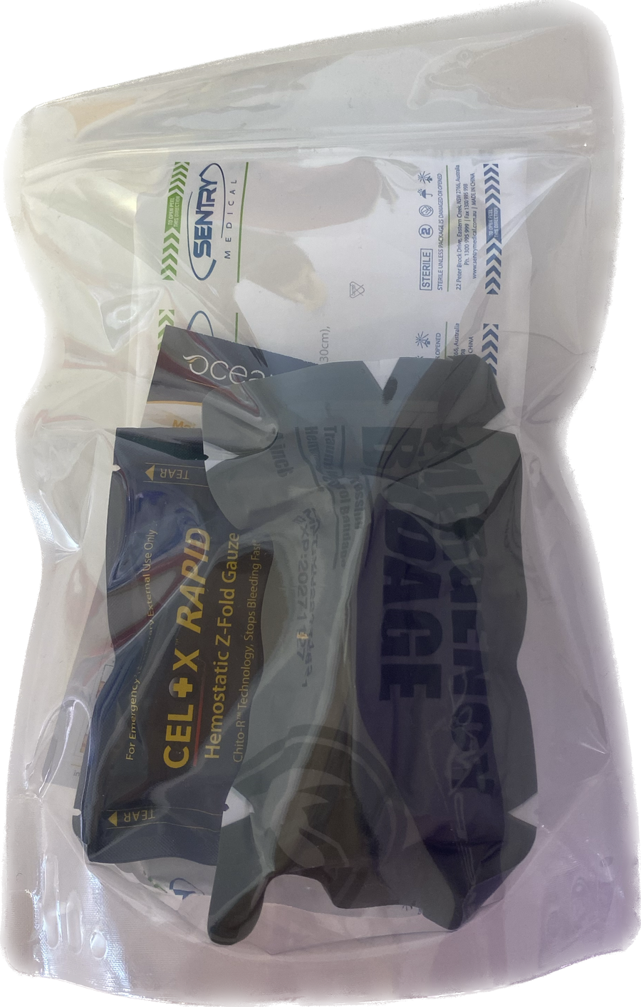 Designed for high risk work sites where sharp tools/machinery may be used. Celox is a military product designed to clot blood after a major bleed. This pack is combined with a emergency field dressing (Israeli Bandage) that provides a compression & wrap system to apply pressure to the bleed site.